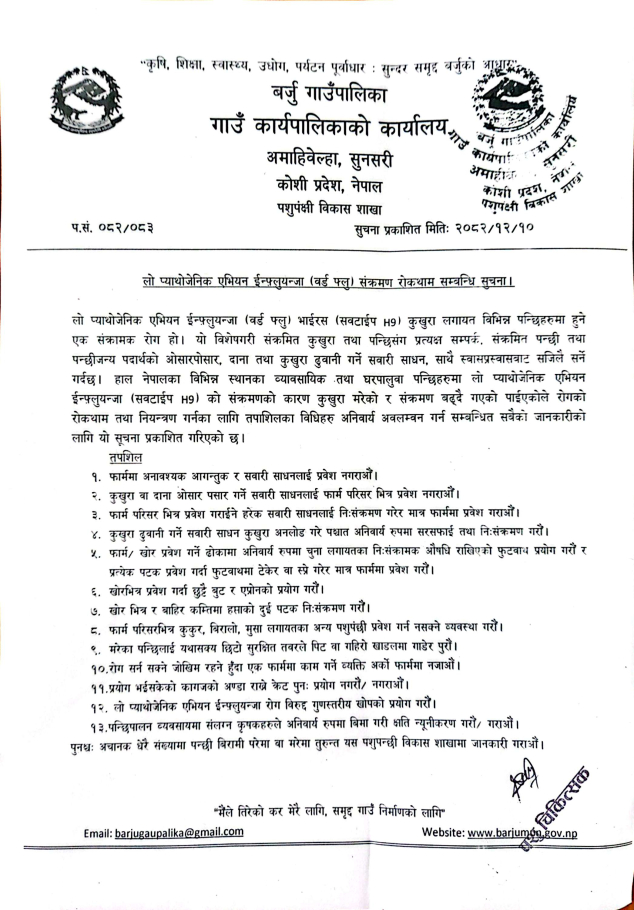 न्युन पशुजन्य क्षमताको बर्ड फ्लू (Low Pathogenic Avian Influenza) संक्रमण रोकथाम सम्बन्धी सूचना