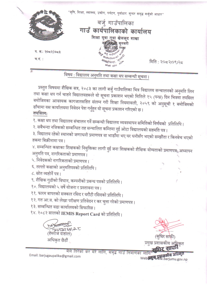 कक्षा थप सम्बन्धी सूचना